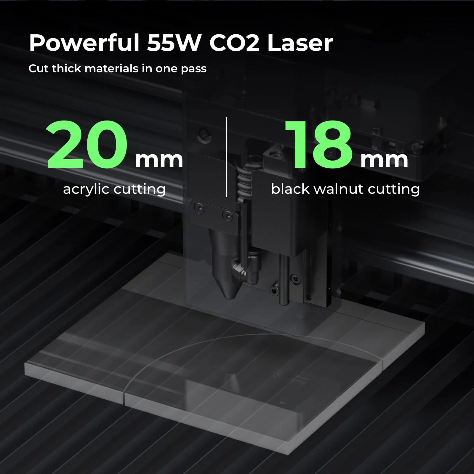 55W Power: 5x Faster than others when cutting 20mm acrylic & 18mm wood in one pass.